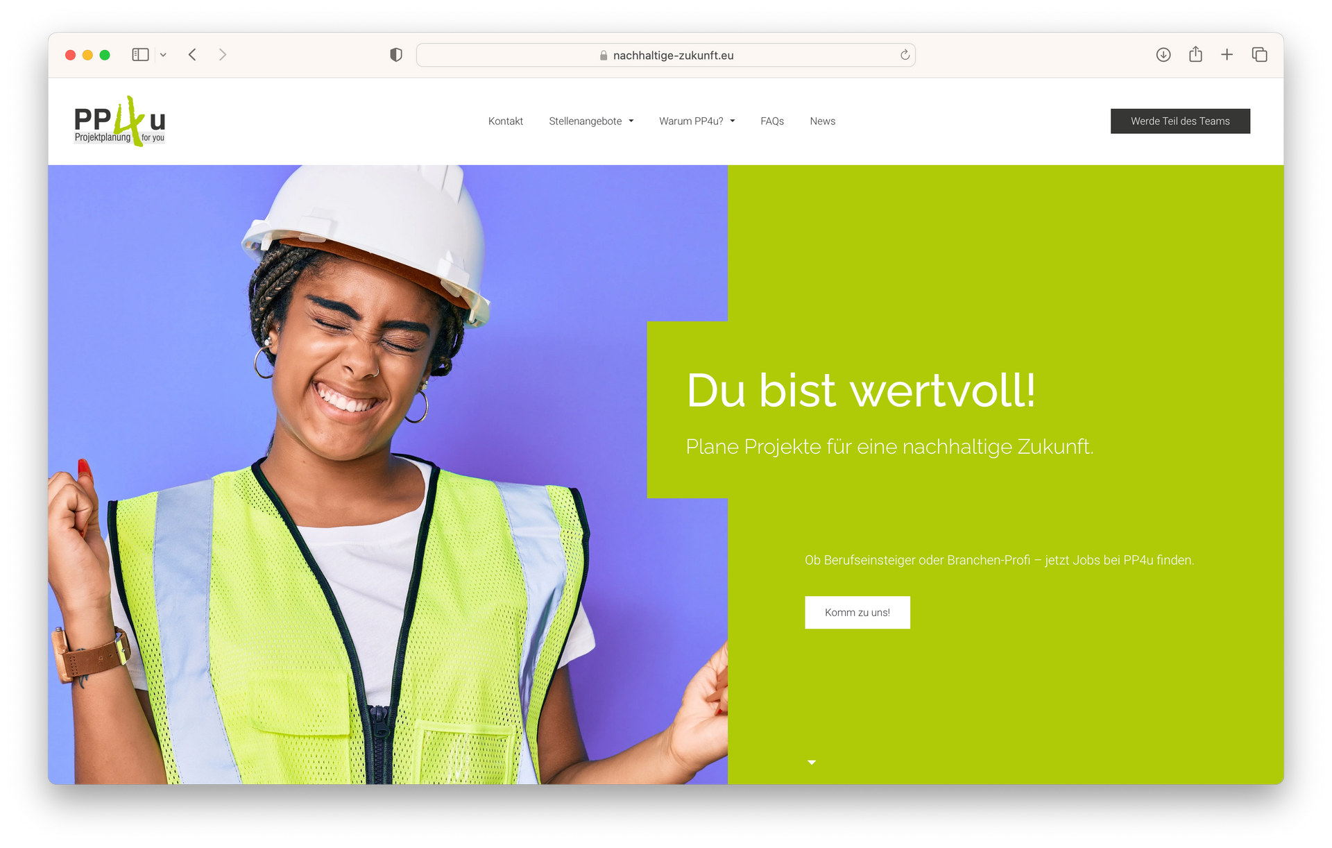 "#Du bist wertvoll!" – so lautet unsere neue Recruiting-Kampagne von PP4u. Wir sind ein Planungsbüro für technische Lösungen in Sindelfingen. Gleichzeitig starten wir auch mit einer neuen "Mach-mit"-Aktionskampagne unter dem Motto "ein Tag pro Woche für die #Umwelt". Beide Kampagnen erscheinen im regelmäßgen Wechsel. Seid gespannt auf den kommenden Donnerstag, wenn es heißt: "#Du bist wertvoll!“.